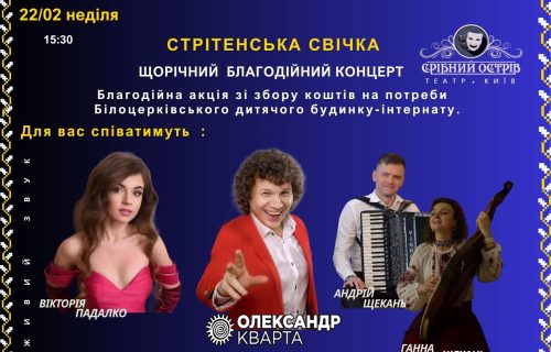 22 го лютого о 15 :30 відбудеться щорічний благодійнийконцерт “Стрітенська свічка”.Метою акції є збір коштів на потреби Білоцерківського дитячого будинку-інтернату.В заході беруть участь:Вікторія Падалко, Ганна та Андрій Щекань,а також Олександр Кварта.Організатори заходу:Благодійний просвітницький фонд « Київський Єрусалим» татеатр «Стрібний острів»Захід відбудеться у театрі «Срібний острів» за адресою:Метро Лук’янівська ,вул. Майбороди, 8.А також за телефоном :099 […]